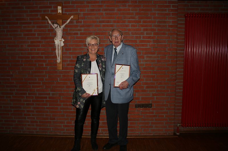 Ein Höhepunkt des Abends war die Ehrung langjähriger Mitglieder. Hier wurde Franz Wess für 65 Jahre Treue zum Kolpingwerk geehrt. Der Jubilar nahm die Auszeichnung unter lang anhaltendem Applaus dankend in Form einer Urkunde und einer Plakette entgegen. Des weiteren wurden für 60 Jahre Vereinszugehörigkeit Heinz Hasenkamp sowie für 40 jährige Vereinszugehörigkeit Irmgard Brinkmann und die Geschwister Doris und Petra Nilling geehrt. Leider konnten nicht alle Geehrten an der Feierstunde teilnehmen. Auch über Zuwachs konnten sich die anwesenden Mitglieder freuen. Neu in die Kolpingfamilie aufgenommen wurden Elias und Achim von Hertzberg.